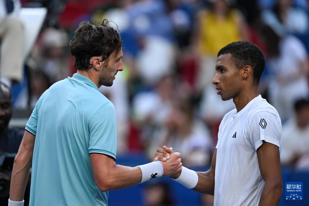 10月10日,兰德克内什(左)与奥热-阿利亚西姆在比赛后握手致意。新华社记者 陈浩明 摄