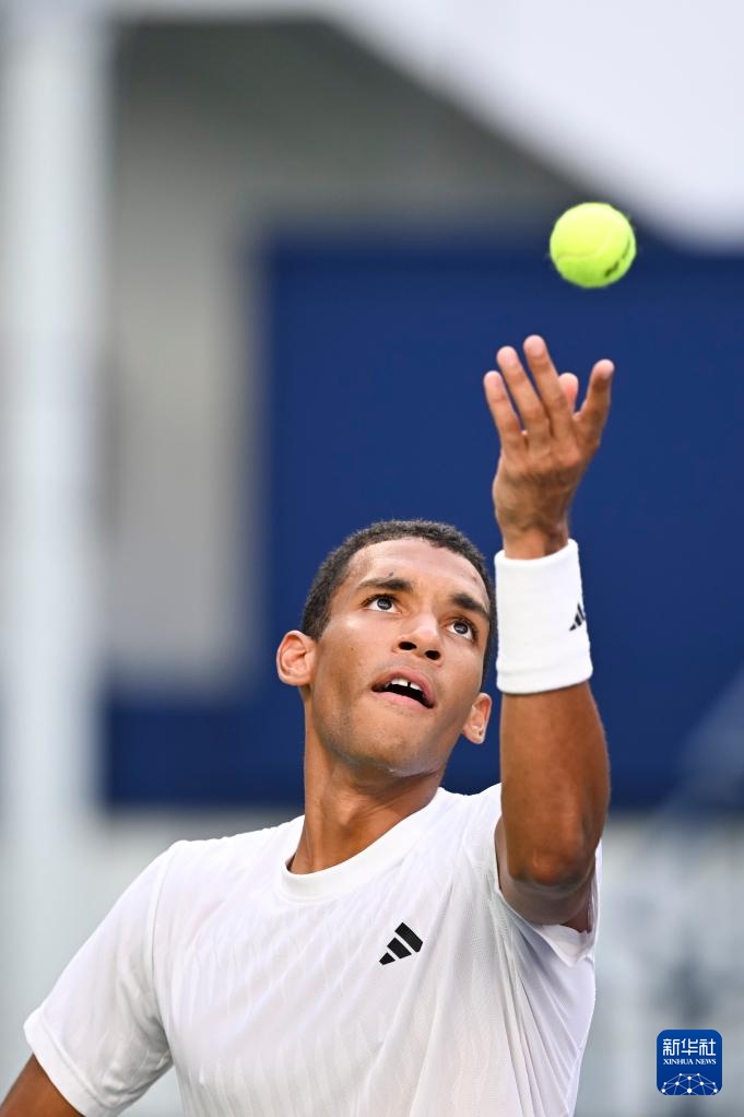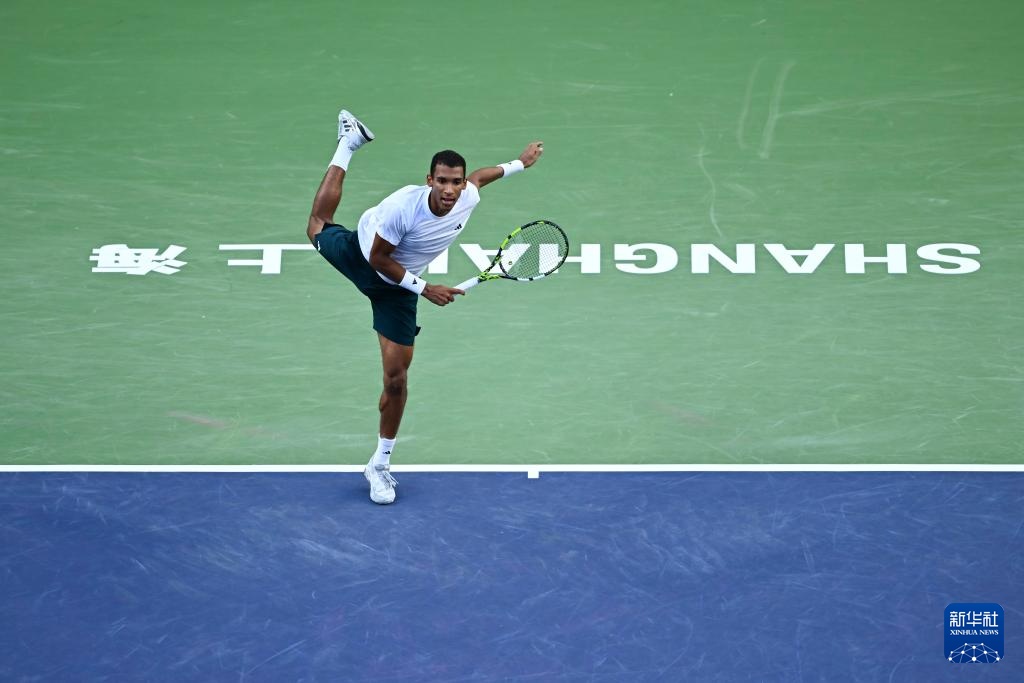 10月10日,奥热-阿利亚西姆在比赛中发球。新华社记者 陈浩明 摄
