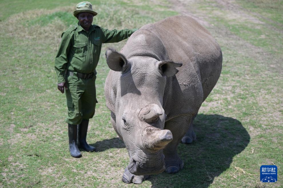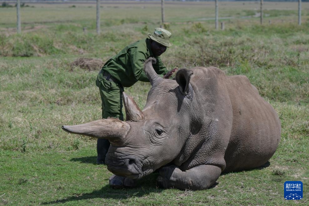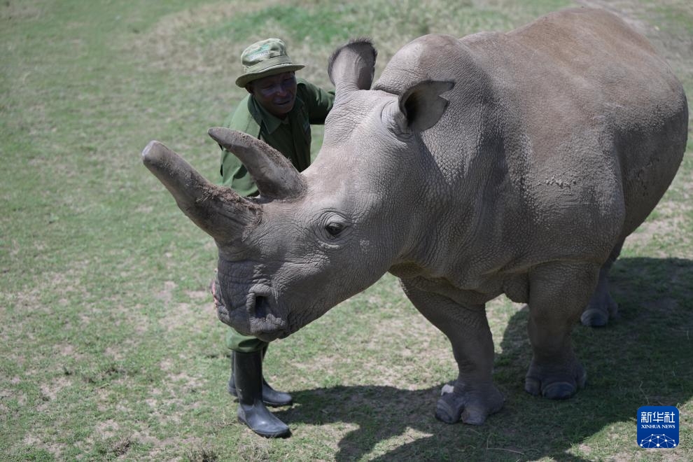 10月7日,在肯尼亚中部莱基皮亚郡奥尔佩杰塔自然保护区,工作人员与雌性北方白犀牛“法图”互动。新华社记者 杨光 摄