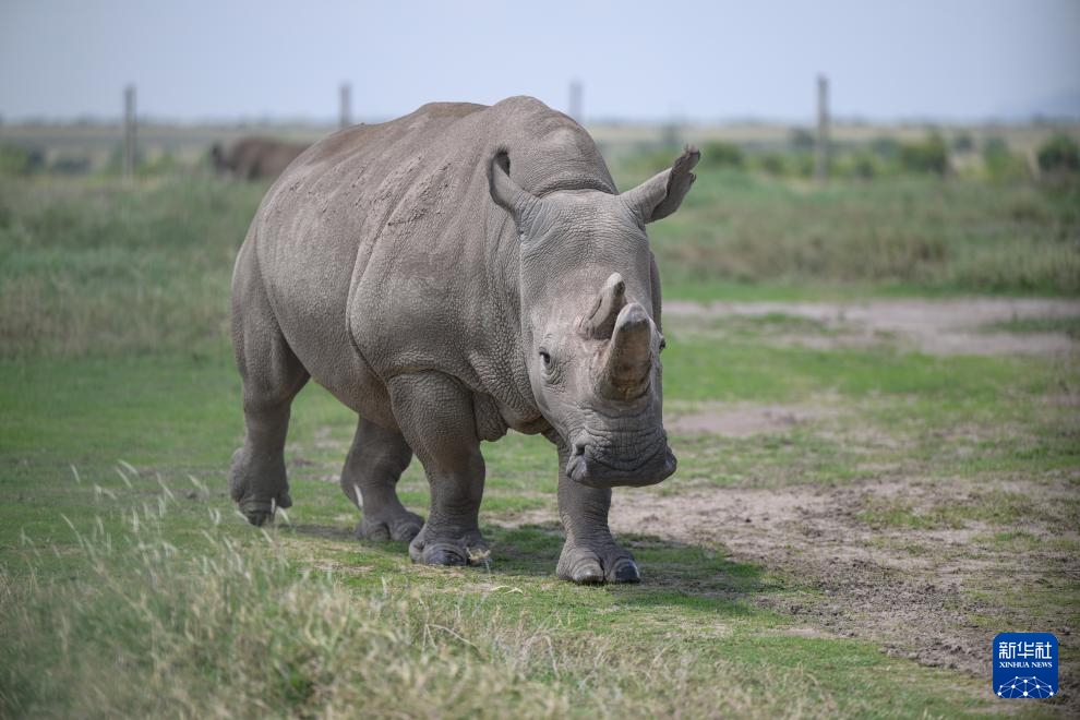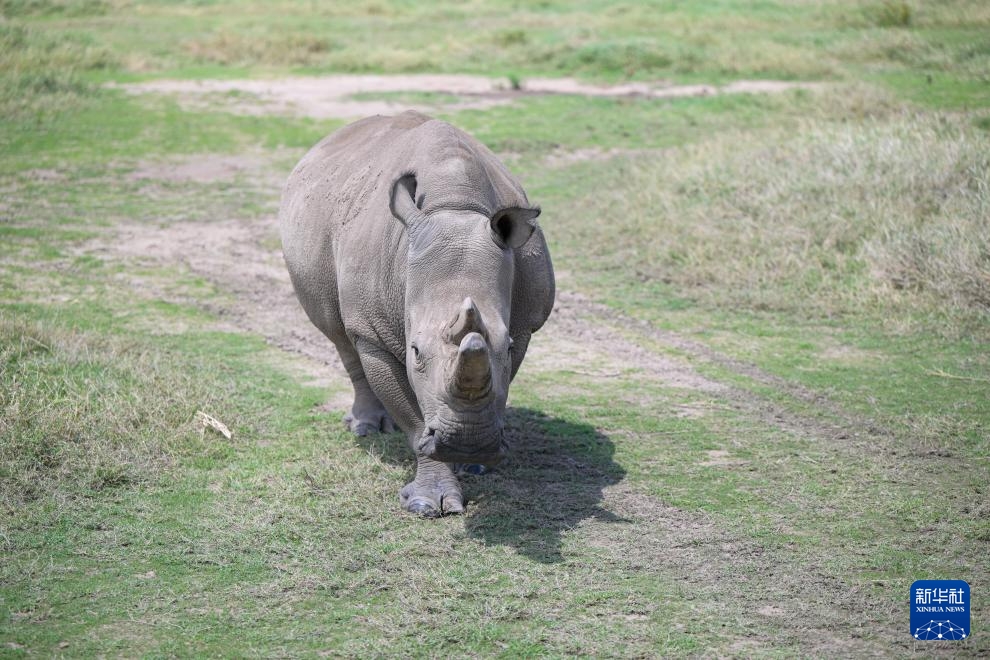 这是10月7日在肯尼亚中部莱基皮亚郡奥尔佩杰塔自然保护区拍摄的雌性北方白犀牛“法图”。新华社记者 杨光 摄