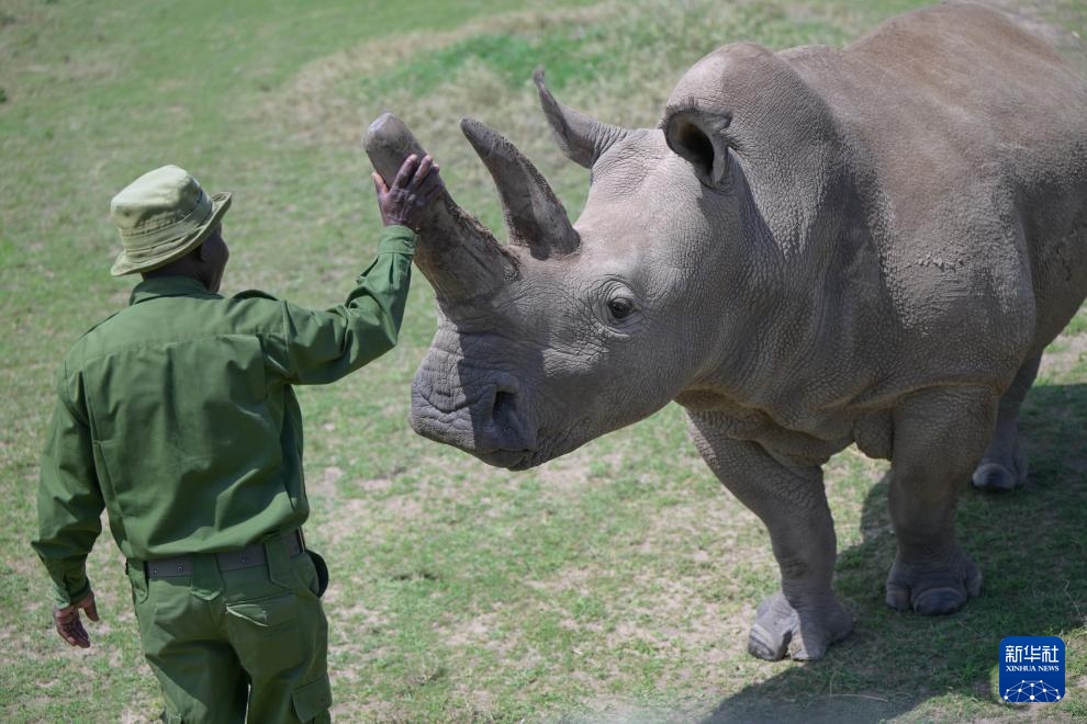 10月7日,在肯尼亚中部莱基皮亚郡奥尔佩杰塔自然保护区,工作人员与雌性北方白犀牛“娜金”互动。新华社记者 杨光 摄