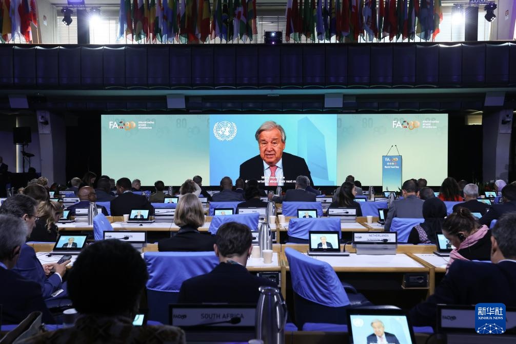 10月16日,在位于意大利罗马的联合国粮食及农业组织总部,联合国秘书长古特雷斯在庆祝活动上发表视频致辞。新华社记者 李京 摄