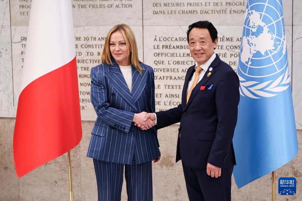 10月16日,在位于意大利罗马的联合国粮食及农业组织总部,意大利总理梅洛尼(左)与联合国粮农组织总干事屈冬玉握手。新华社记者 李京 摄
