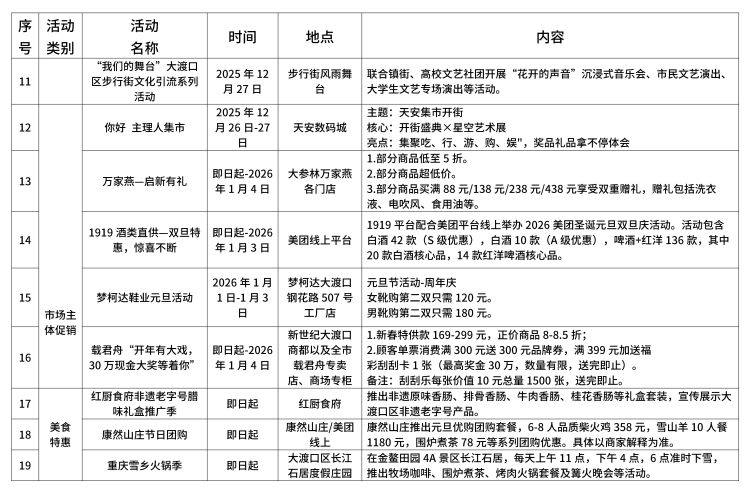 大渡口区相关负责人表示,为确保活动有序开展,大渡口区强化组织统筹,形成部门协同、镇街联动的工作合力,通过全方位渠道扩大活动知晓度;同时落实硬举措保障安全,督促企业完善安全预案,畅通消防、疏散等设施,为市民游客营造安全放心的消费环境,让大家在欢乐氛围中畅享元旦假期。