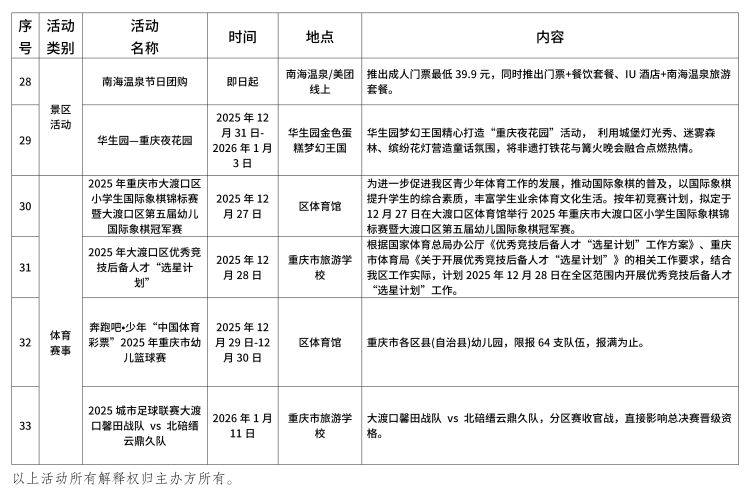 舌尖上的盛宴同样不容错过。红厨食府、长江石居、康然山庄等餐饮商家精心筹备,推出腊味礼盒团购、雪乡火锅季、农家刨猪汤等折扣优惠,联动媒体持续擦亮义渡名店名菜、大渡口江湖菜等美食IP,让本地市民与外地游客共享地道“义渡味道”。文旅体融合活动则为假日生活添彩,博物馆的文物黏土手作、图书馆的元旦主题图文展、绘本阅读等文化活动兼具知识性与趣味性;大渡口区爱情地标跨年夜首秀邀请150名体验官共赴浪漫,华生园梦幻城堡的灯光秀、南海温泉的团购套餐带来多元游玩选择;大渡口区小学生国际象棋锦标赛、2025年重庆市幼儿篮球赛、渝超联赛大渡口馨田战队主场比赛等体育赛事接连上演,让不同年龄段市民都能找到专属乐趣。